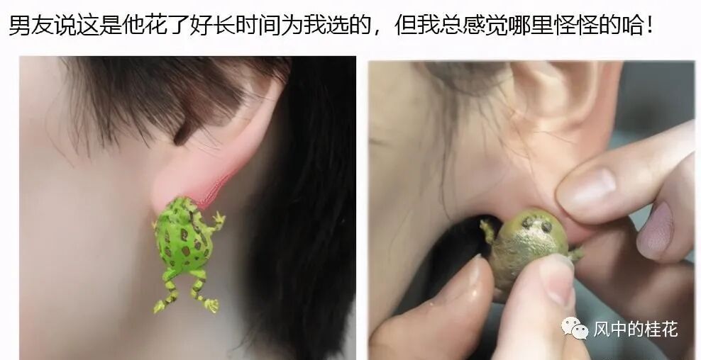 很多男孩子在给女孩子选礼物的时候都是脑回路清奇的,比如这个吓人的耳钉,不知道男友送这个礼物到底是为了恶搞还是纯粹觉得有意思,女孩子带耳钉不是为了满足自己猎奇心理的,而是为了点缀自己整体的搭配,让自己看起来更有风格,更有亮点,但是这个耳钉,是不是就有点超出了我们的审美范围呢?