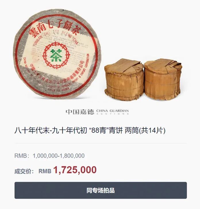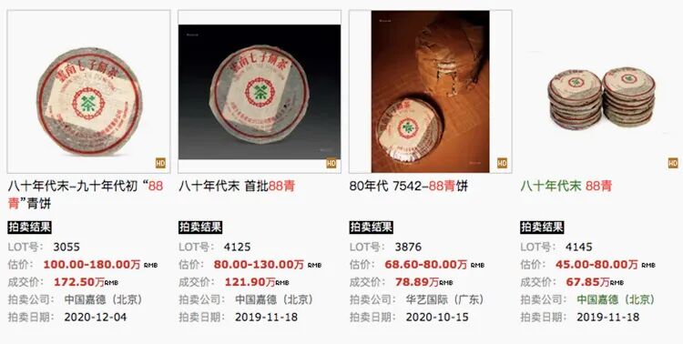 它是由原勐海茶厂1989年-1992年制作,唛号为“7542”的普洱生茶,后被港商陈国义所发掘。在它之前,普洱几为湿仓储存。但这生茶,经过一段时间干仓储存、陈放转化后,滋味竟高香纯净。一推出,市场反应热烈,追捧者汹涌而来。中国嘉德2020秋季拍卖会,两筒14饼“88青”,拍出172.5万。短短30年,88青,从7.8元港币/饼,飙升到12.3万/饼的天价,升值万倍!这速度,简直让人眼红。