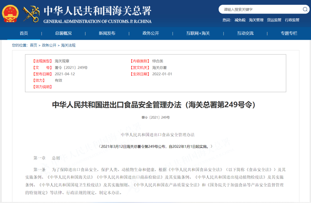 根据海关总署第249号令《中华人民共和国进出口食品安全管理办法》
