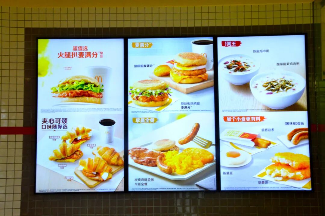 餐厅的工作人员介绍“从早晨七点开始,我们会替换门口的招牌,还有电子屏上的餐品信息,十点半的时候更换为正餐。”