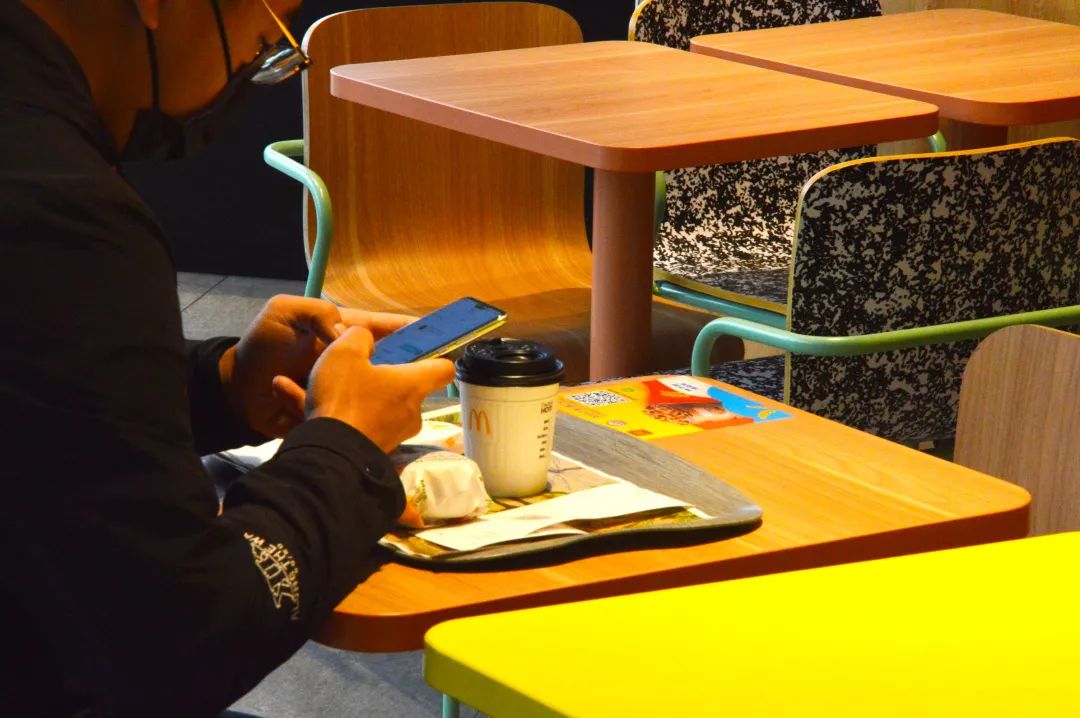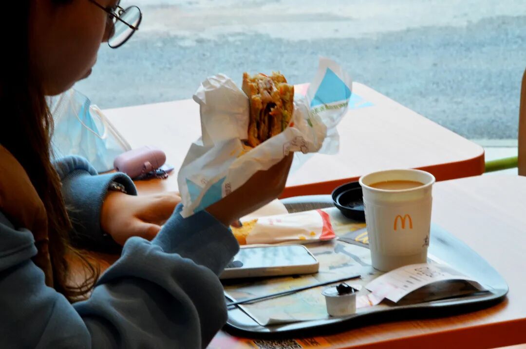 来麦当劳餐厅购买早餐的,多是附近的上班族和白领,在上班前抽出半个小时,来店里点咖啡、吃面包或汉堡,看看窗外的春日美景,时间充裕,心情美好。