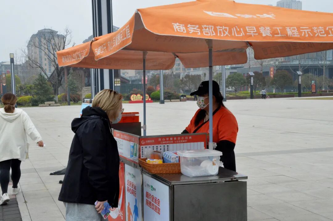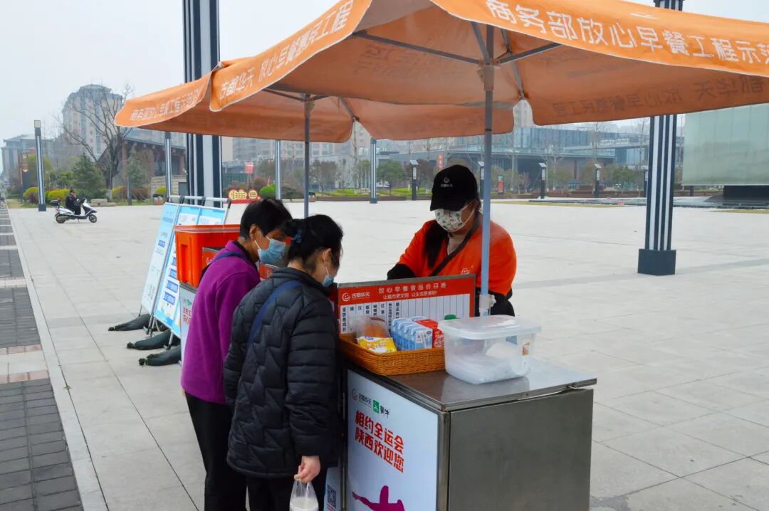 供应放心、销售放心、品尝放心。放心早餐的出摊点,位于沣东文化广场的西侧,红绿灯附近就能看到放心早餐的摊位。
