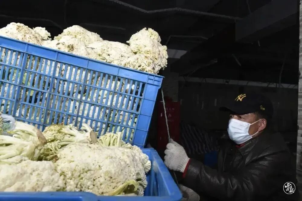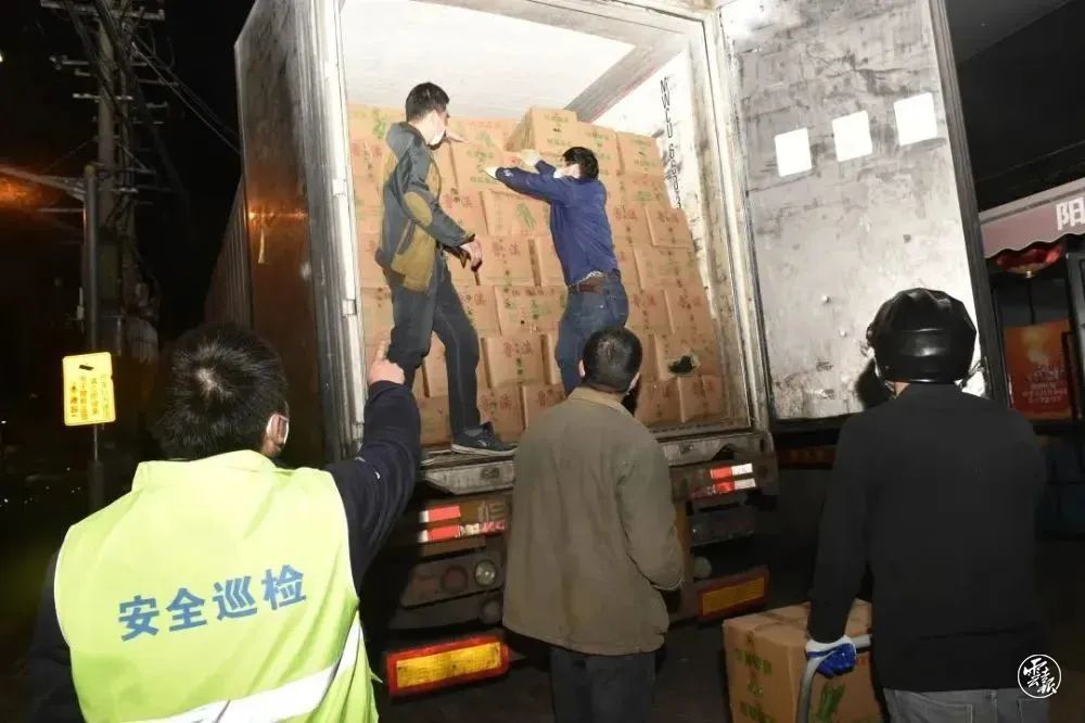 晚上11时,在阳普生鲜凤城店,工作人员们将一箱箱蔬菜卸下来,再由杨浦商贸集团连夜接收完蔬菜并完成分拣,等待各菜市场前来领取。