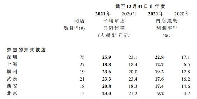 3月29日晚间,奈雪的茶发布2021年全年业绩公告,这是奈雪的茶上市以来的首份年报。报告显示,2021年,奈雪收入42.97亿元,同比增加40.5%,净亏损达45.25亿元,经调整净亏损金额达1.45亿。作为新式茶饮的第一股,从投资者的角度上看。奈雪上市后就破发,股价从18块腰斩再腰斩至目前的4块钱,在二级市场中,投资者已经对奈雪失去信心。而更糟的是,公司烧钱也没烧出更好的口碑,从消费者的角度上看,可以说去年奈雪在就开始有些束手无策。在上市后不久就被曝出食品安全问题,及面对喜茶的不断创新以及降价,奈雪在创新方面已跟不上喜茶的步伐,奈雪也只能降价来抵抗喜茶的攻势,目前奈雪单品最便宜为9元一杯。来源:富途一、奈雪的茶为何野蛮生长?从奈雪一开始上市的估值来看,投资者都看好新式茶饮市场的前景,看好奈雪的茶在新式茶饮市场有着不错的成长性。但在上市后奈雪的情况并未转好,反而在门店运营及二级市场中惨遭毒打。对于新式茶饮行业来说,门店数量是最为看重的增长指标之一。从财报中看,奈雪的茶亏损的根源在于追求高速的扩张。据财报显示,2021年奈雪的茶新增326家门店,截止2021年,奈雪的茶在全国80个城市拥有817家门店,在同行业当中的上海、深圳、广州排名前三。而面对不断的亏损下,奈雪仍然选择“野蛮生长”。据财报中透露,奈雪的茶预计2022年将继续扩张350家门店,开店位置为一线以及新一线城市。在奈雪的茶上市前,奈雪的开店速度始终被喜茶压一头,但在上市拿到更多钱的奈雪,开店速度终于赢过喜茶。根据喜茶的年报,2019年至2021年,喜茶每年的开店数量都是200+店起,其中2020年更是开店305家。但论总门店来看,目前奈雪还落后于喜茶。喜茶在2021年报中透露,门店总数超800家,而奈雪是在2021年底才达到800家。虽然奈雪在门店数量力追喜茶,不过在创新及营销方面都跟不上喜茶,而这也是为什么奈雪只能拼开店速度了,用此来抗衡喜茶争夺一线城市的市场份额。从新增门店中可以看出,奈雪的主战场在一二线城市。由于新式茶饮的客单价越来越高,一二线城市的布局越发重要,占据了一二线市场,才能有机会将高利润饮品销量提高。