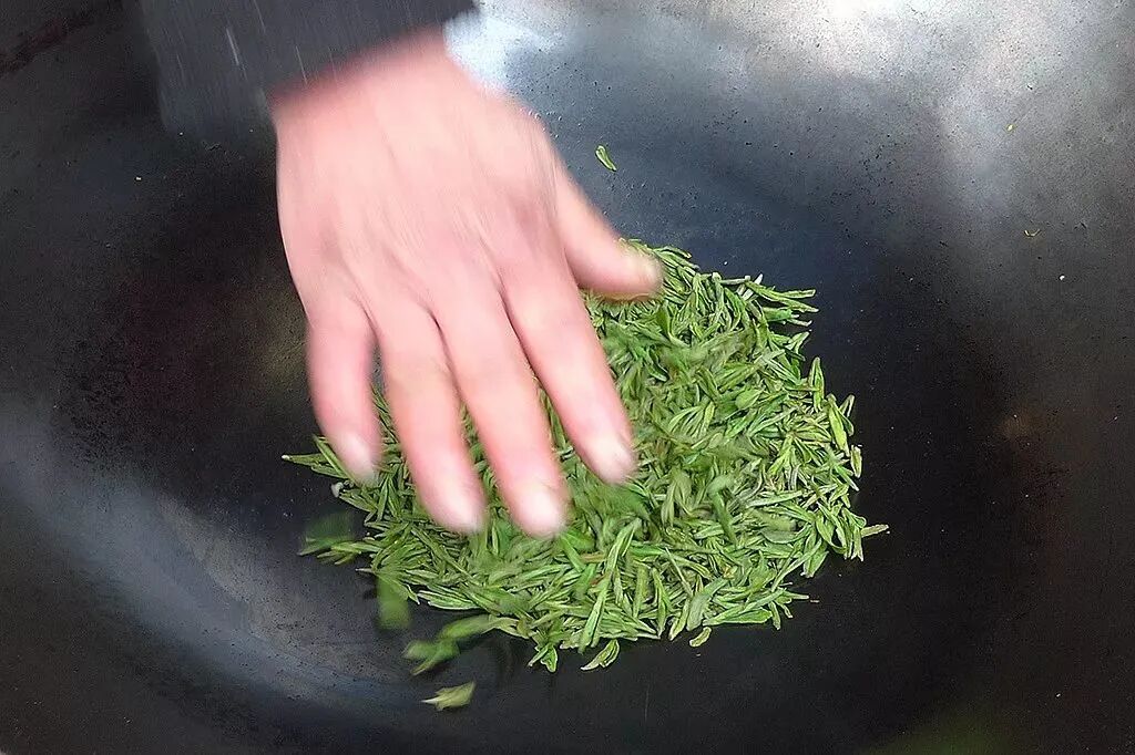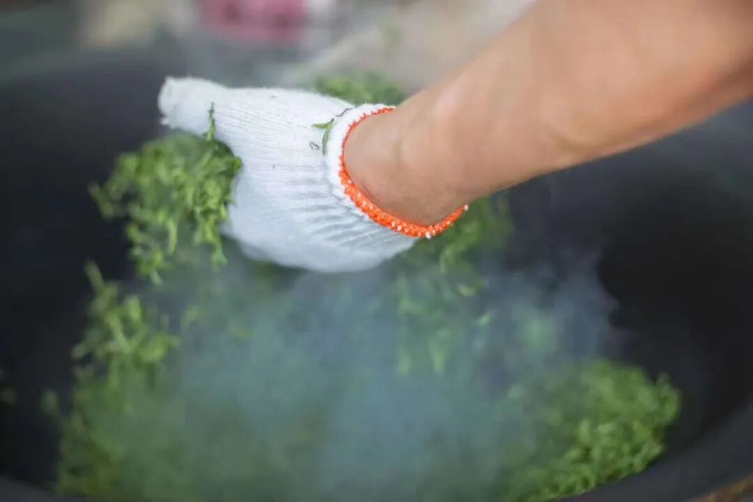 杀青一般可分为加热杀青和热蒸汽杀青两种方式。后续的干燥工艺也有炒干、烘干和晒干。