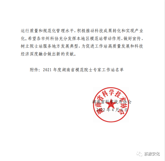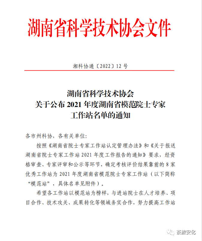 近日,经省有关部门、专家组综合评审和现场考察,最终确定刘仲华院士专家工作站为“2021年度湖南省模范院士专家工作站”。