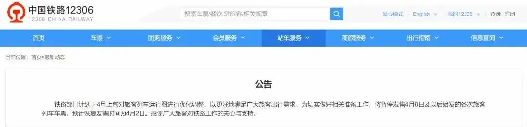 自2022年4月2日8时起,恢复对外发售西安局始发乘车日期为4月8日至4月15日的旅客列车车票。3月26日,中国铁路12306网站发布公告:铁路部门计划于4月上旬对旅客列车运行图进行优化调整,以更好地满足广大旅客出行需求。为切实做好相关准备工作,将暂停发售4月8日及以后始发的各次旅客列车车票,预计恢复发售时间为4月2日。感谢广大旅客对铁路工作的关心与支持。来源:陕西广电融媒体集团·起点新闻