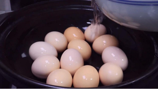 2、清洗干净的鸡蛋,我们要给它加入到砂锅中,然后往里面加入适量的清水没个鸡蛋,并盖上盖子,给他煮上15分钟。