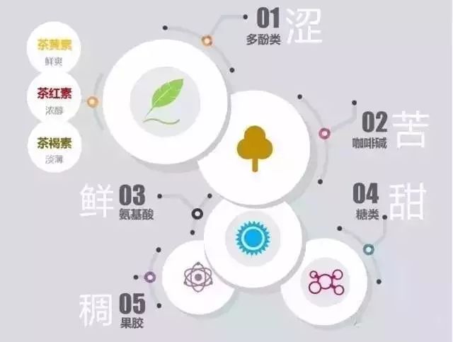 一片树叶,通过杀青、萎凋、揉捻、发酵(爆炒、清蒸、红烧 )等工艺,各种物质形成了不同风味,那么究竟是哪些物质在刺激你的味觉呢?看下面这张图你就懂了。▲茶的内含物质与茶汤口感的对应关系