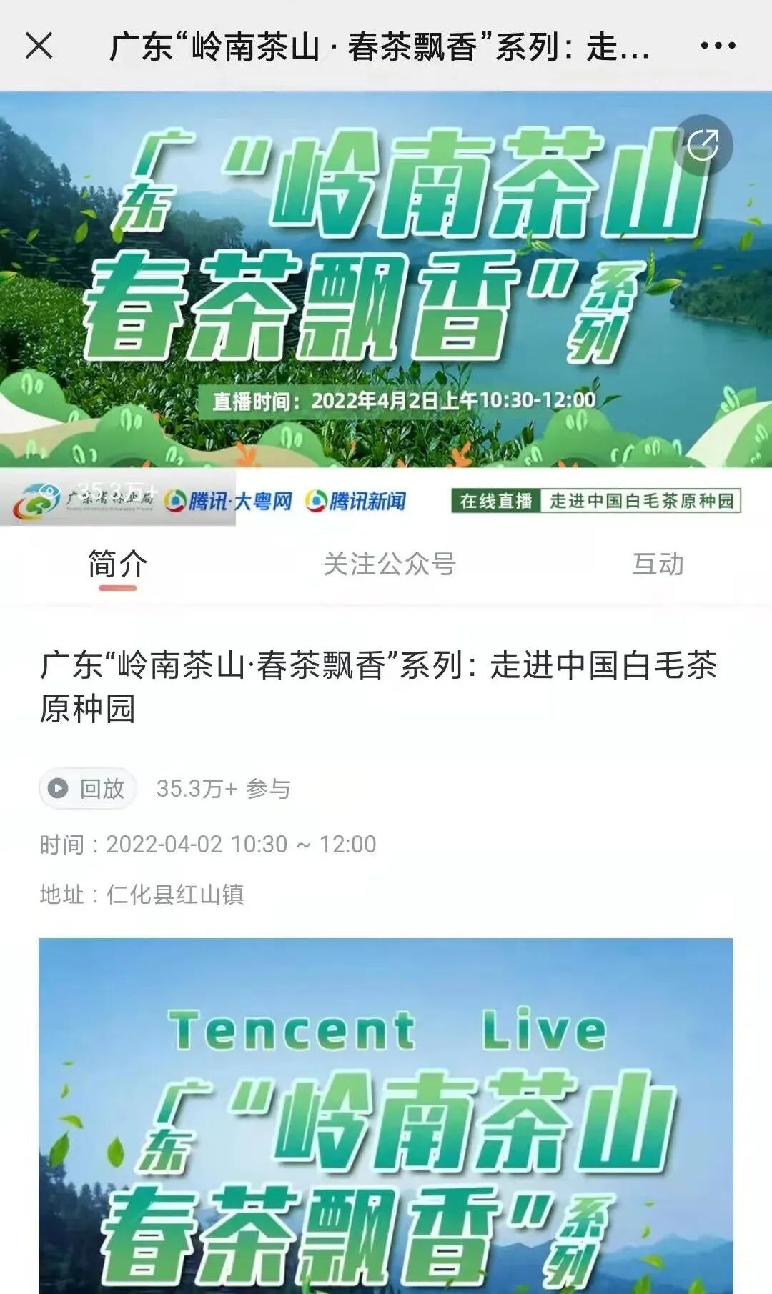4月2日,省林业局携手腾讯新闻在韶关市仁化县红山镇开展“岭南茶山·春茶飘香”系列直播,带领观众走进中国白毛茶原种园,推动仁化茶品牌建设,促进乡村产业兴旺发展。活动通过腾讯新闻平台全程网络直播,走进广东省十大茶乡之一——韶关市仁化县红山镇,带领观众领略原生态的茶魅力,共35.3万名网友在线观看。● “好山好水出好茶”,仁化县红山镇森林覆盖率达90%,山高林茂,终年云雾缭绕。这里有1300多年的种茶历史,孕育出提神醒脑、生津解渴、带有兰花香味的原种白毛茶,素有“中国白毛茶之乡”的美誉。