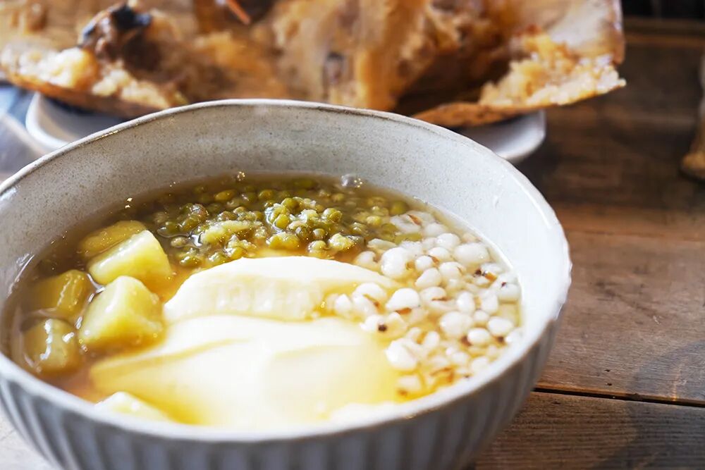 八宝饭以糯米为主,它的“八宝”并不是固定不变的,常见的有豆沙、枣泥、果脯、莲心、薏仁、桂圆,有些还会加入水果和坚果等。