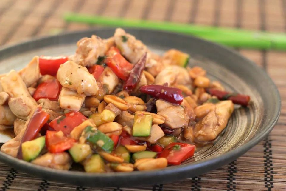 宫保鸡丁就是把鸡丁、辣椒和花生一起大火爆炒而成,吃的时候甜中有辣,辣中有甜,十分美味。