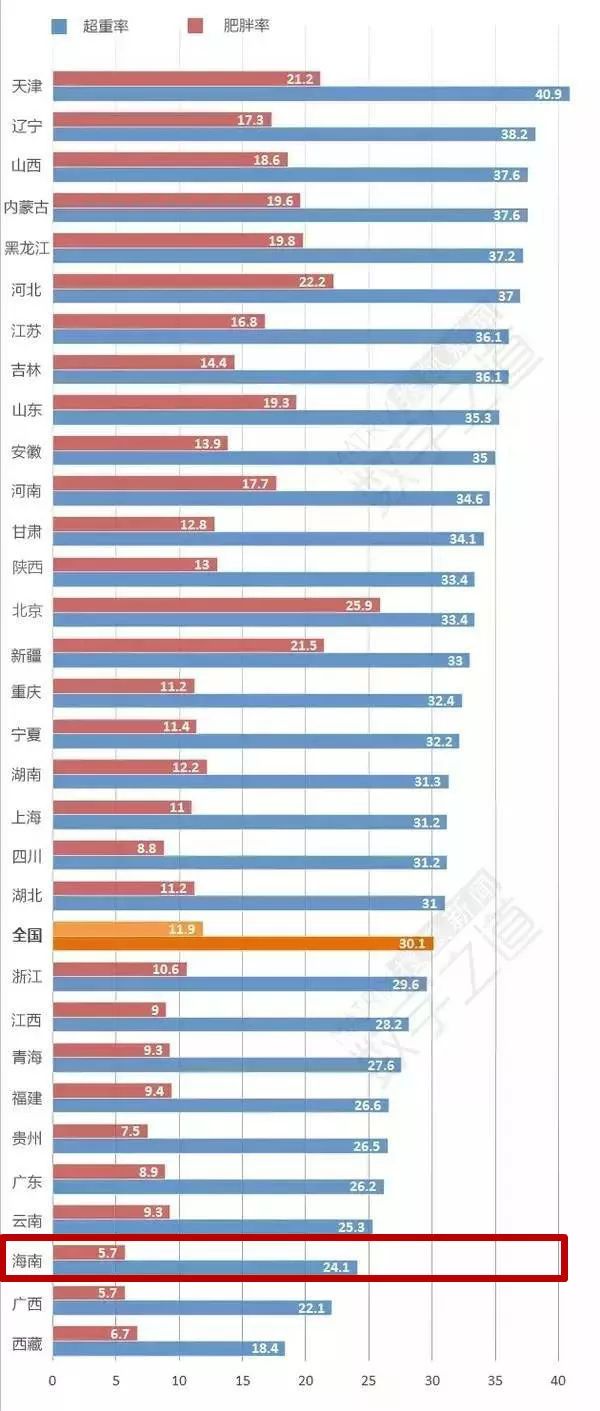 其中,海南是全国百岁老人密度最大的省份。据统计,海南有百岁及百岁以上长寿老人1371人。换而言之,海南平均每10万人就有百岁老人13人。海南的长寿指数居全国之首。03、 海南是肥胖率倒数的地方2017年中国疾病控制中心发布的《慢性病及其危险因素检测数据报告》中,海南的肥胖率为5.7%,超重率为24.1%。不仅远低于全国平均水平在全国被统计的31个省中,还排在了倒数第三!