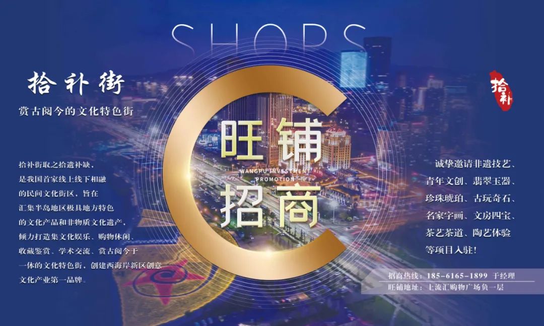 拾补街取之拾遗补缺,是我国首家线上线下相融的民间文化街区,旨在汇集半岛地区极具地方特色的文化产品和非物质文化遗产,倾力打造集文化娱乐、购物休闲、收藏鉴赏、学术交流、赏古阅今于一体的特色文化街,创建西海岸新区创意文化产业第一品牌。