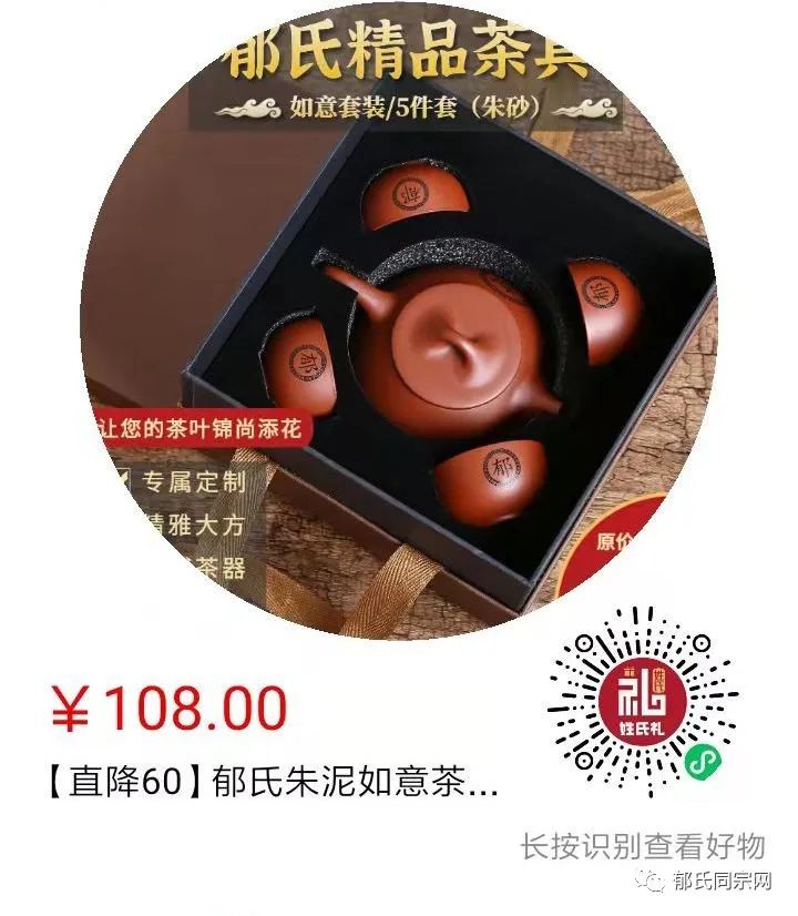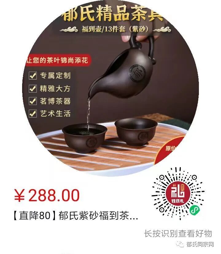 这两套郁姓定制茶具礼盒,将郁姓文化融入饮茶文化中,让宗亲在会客、品茗、谈吐之间,构成一种情感上的联系,形成一种 新的艺术生活体验!