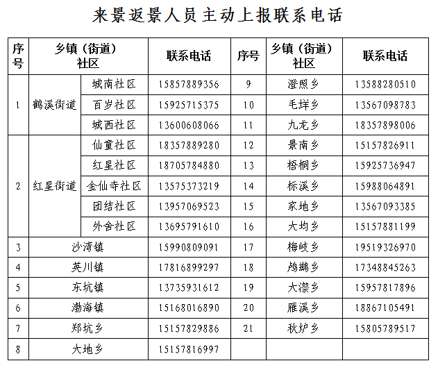请在上述相同时间、相同地点与密接人员可能有接触或轨迹交叉的人员,第一时间向所在乡镇(街道)、村(社区)(联系电话附后)申报或拨打12345申报,做好个人防护,居家不外出,服从属地管理,配合做好核查、流调和管控工作,如瞒报、迟报、谎报将依法追究相关责任。