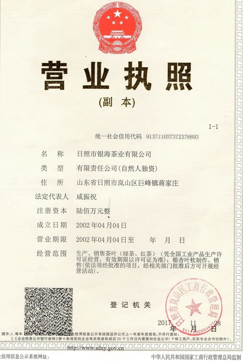 企业信息企业名称:山东省日照市银海茶业有限公司企业地址:山东省日照市东港区泰安路兴业新营华府东区南沿街企业联系:400-0633-696企业介绍:山东省日照市银海茶业有限公司成立于2002年,以江北绿茶之乡巨峰镇万亩优质绿茶基地为依托。现拥有生态茶园300余亩,是集名优绿茶、红茶、银杏茶的科研、种植、加工、销售、茶文化于一体的综合型茶叶企业。公司自成立以来,始终重质量、讲信誉,2006年通过QS食品质量安全认证。公司产品先后获得“中国名优茶叶十佳畅销品牌”“山东省首届名茶评比优质奖”。2009年“日照银海”商标被山东工商行政管理局确认为山东省著名商标。2012年成为首批使用“日照绿茶”中国驰名商标的茶企。2013年成为可使用日照绿茶地理标志保护产品专用标识的企业。公司先后被评为AAA级诚信企业、“日照市诚信经营示范单位”“十大放心茶示范店”“十佳创新企业”。2016年“日照银海”牌绿茶被山东省质量技术监督局评为山东名牌产品,2019年被评为中国著名品牌、日照市重点龙头企业,2020年公司选送的银海绿茶荣获第十届“中绿杯”银奖。企业官网:www.yinhaitea.com企业邮箱:rizhaoyinhai@163.com营业执照:
