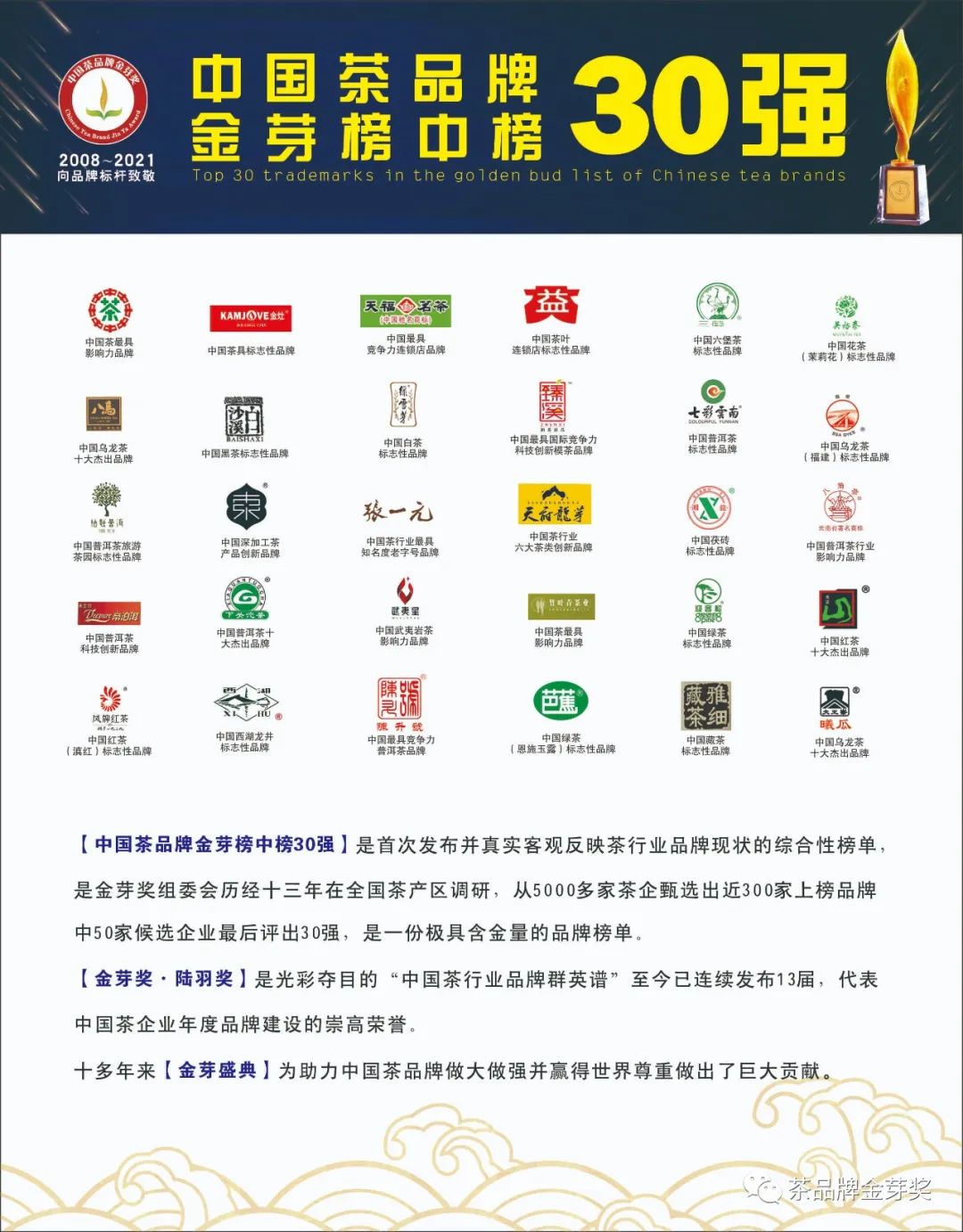 据悉,“金芽奖”历经十三年在全国茶产区调研,从5000多家茶企中甄选出近300家上榜品牌,在业界素有中国茶行业品牌“奥斯卡”的美誉,致力于推动对中国茶企业(产品)品牌的打造和推广,由于专业性和公信度,在业界引起了很大关注和影响力。