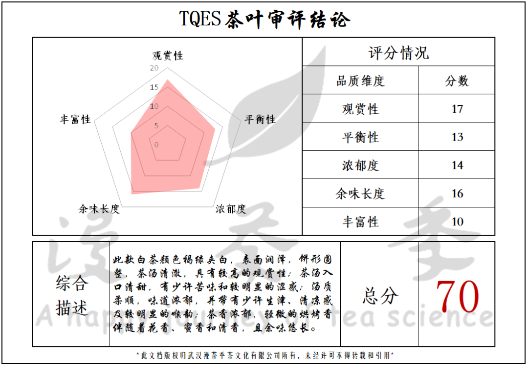 由审评结论我们可以清晰的看出这款茶的品质情况:该茶在观赏性、浓郁度及余味长度方面都有尚佳的表现,而平衡性和丰富性表现尚可,属于一款品质很好的白茶。