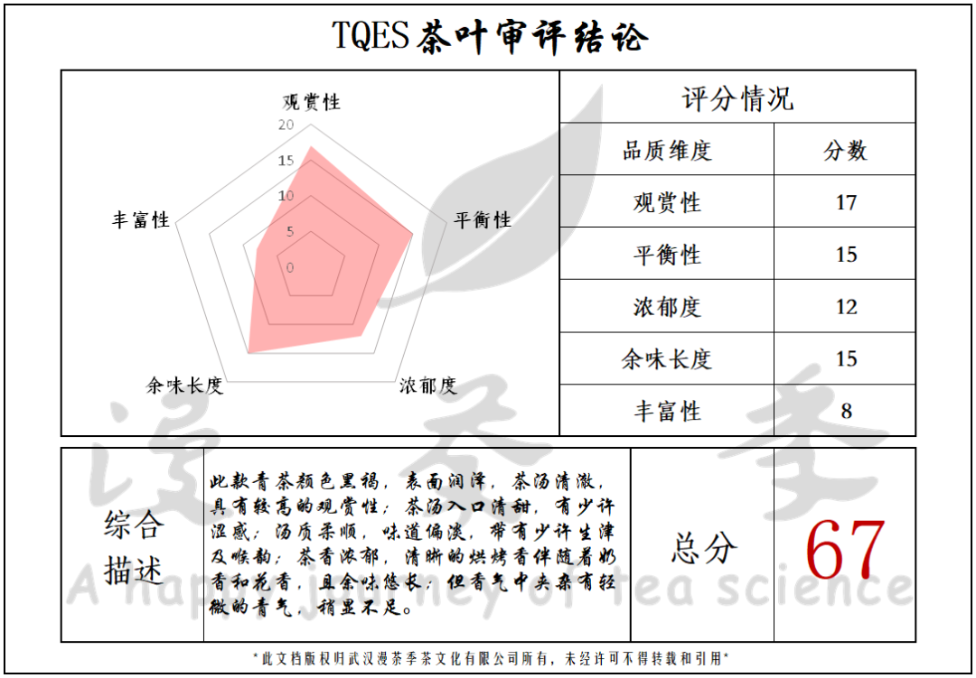 由审评结论我们可以清晰的看出这款茶的品质情况:该茶观赏性和余味长度尚佳,在平衡性、浓郁度及丰富性方面都有尚可的表现,虽有轻微缺陷,仍属于一款品质很好的青茶。