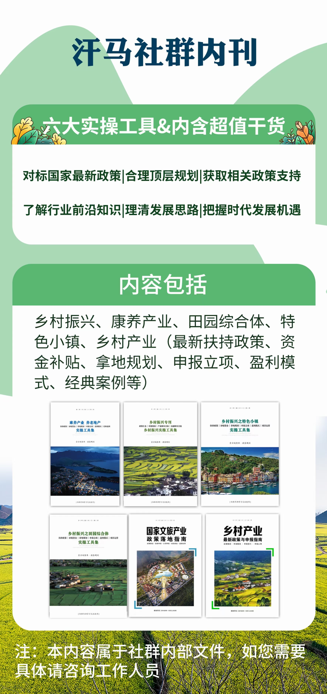 农文商康旅项目知识干货内容,包括但不限于乡村振兴/康养文旅、田园小镇项目顶层战略、产业IP、一体化内容设计精彩案例解读等。精选标杆案例、体验最新内容,从综合体运营到业态创新共同到一线学习、思考、收获!