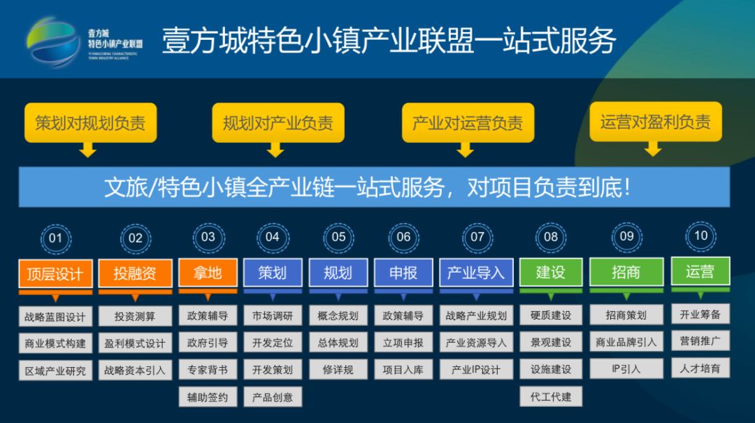 壹方城 是中国文旅康养、特色小镇产业生态圈服务的领跑者,是创新企业家学习平台、文旅康养、特色小镇产业创新方案集成者、创新项目IP孵化的实践者。公司致力于推动文旅康养、特色小镇行业的从开发到运营、从空间到内容的转型。依托强大的线上线下运营能力,致力于完善相关 产业链周边生态,成为最大的文旅康养、特色小镇产业综合服务平台。