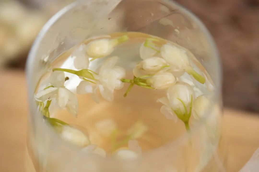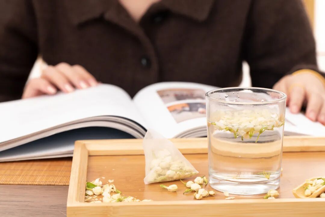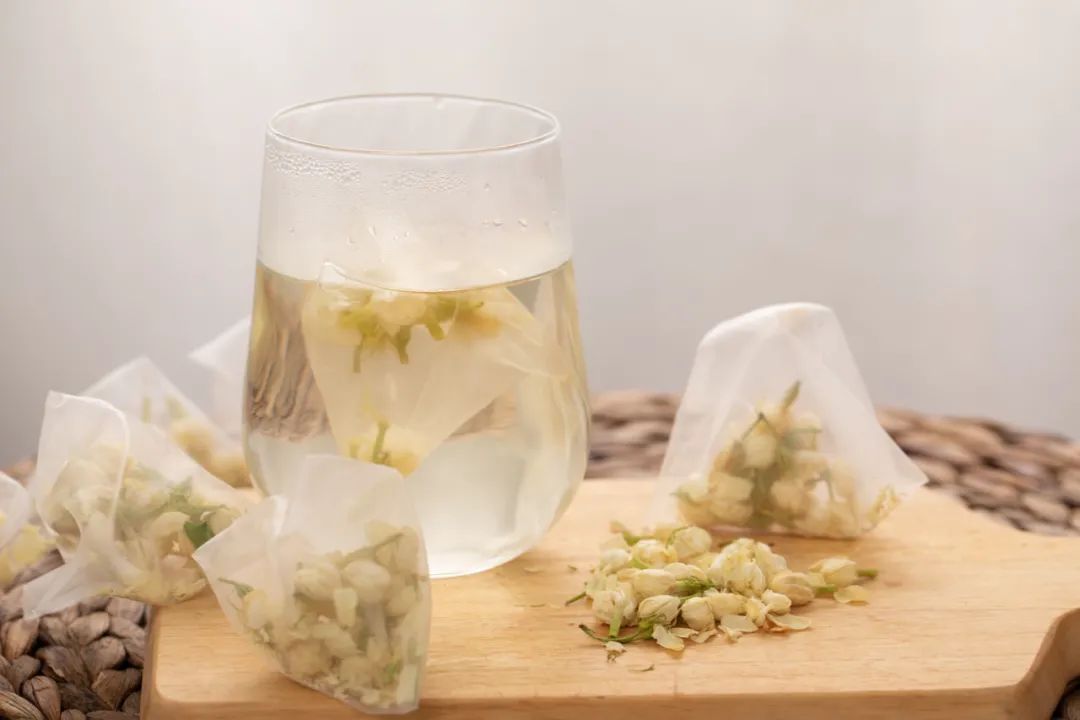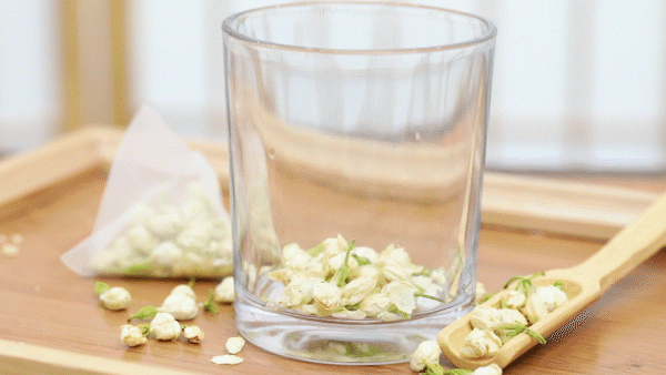 取一袋茉莉,投入常温水至8分满。静置2小时即可饮用,冷藏一晚更佳。搭配茶叶一起饮用,就能DIY一杯花香馥郁的茉莉花茶。