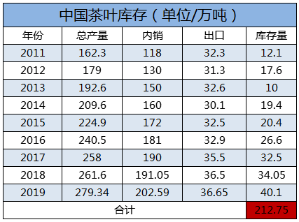 保守估计,根据2011-2019年的茶叶产销形势数据,我国茶叶库存就已经超过200万吨。陷入价格高、喝不起、库存重的恶性循环!这些现象值得我们反思!