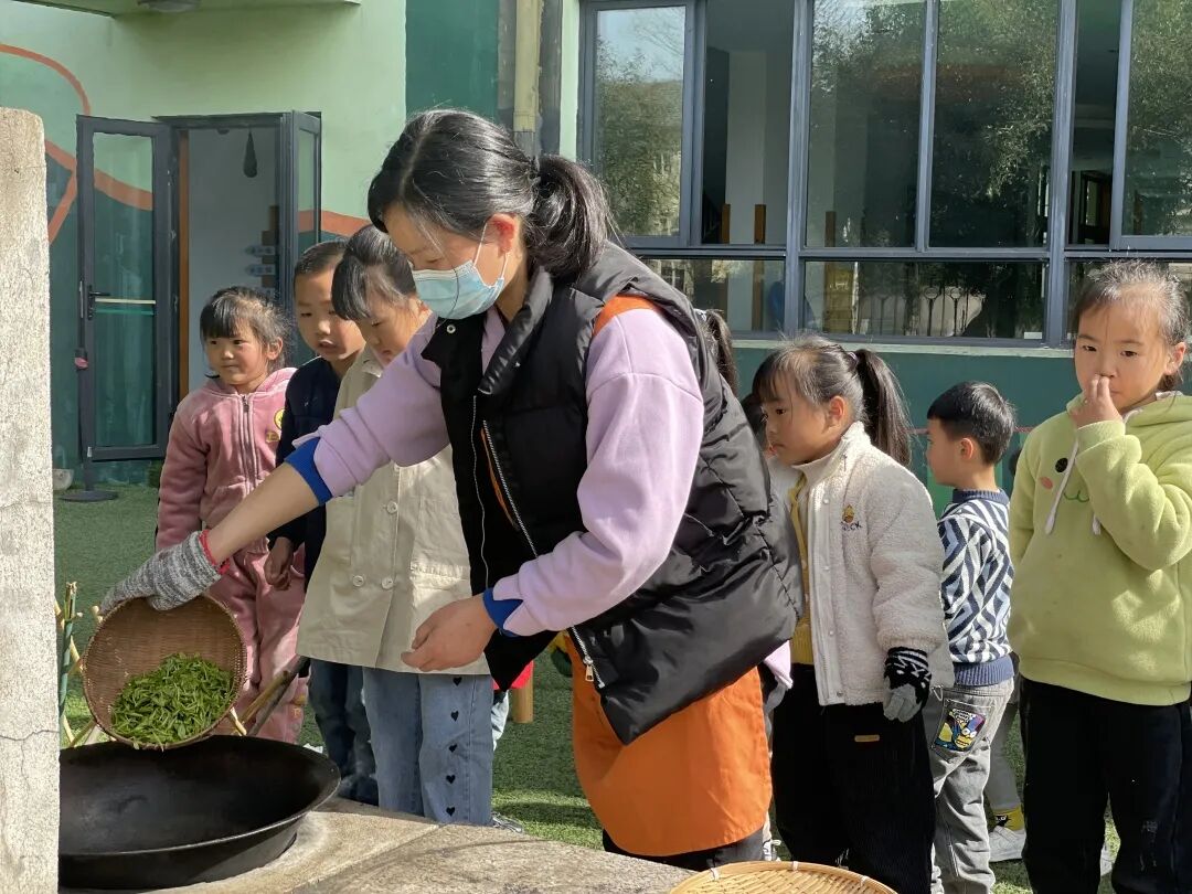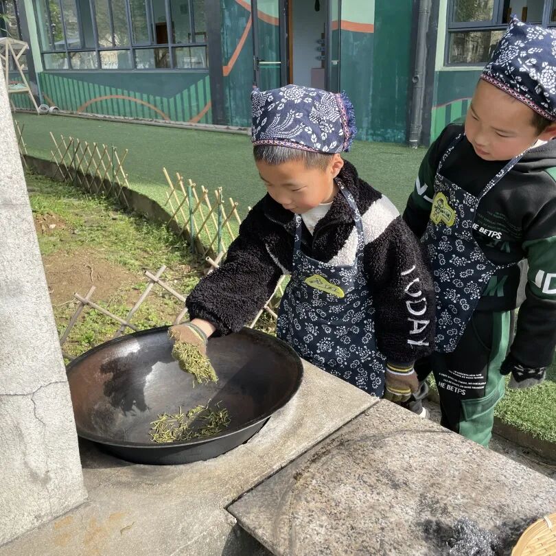 采来的新鲜茶叶怎么办呢?我们可不能浪费了,于是从网上查阅关于炒茶的方法。老师和小朋友初次尝试炒茶叶……