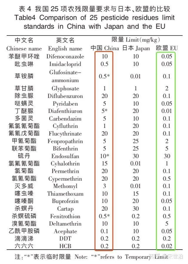 瞎子都能看出来,多数指标,中日标准比欧盟高了几十~几百倍。