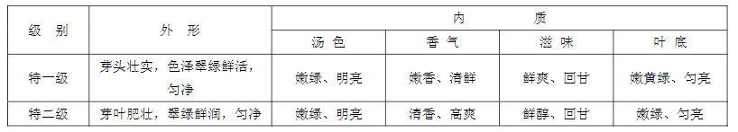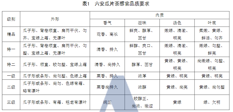执行标准:《NY/T 781-2004 六安瓜片茶》、《DB34/T 237-2017 地理标志产品 六安瓜片茶》