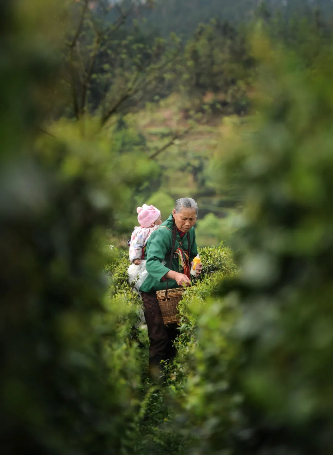 桂东县桥头镇,一位老人背着婴儿,一手拿着奶瓶另一只一手采摘茶叶。图/杨旭▼
