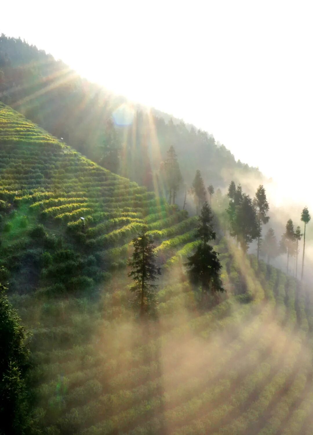 湘西保靖县吕洞山,晨曦的太阳光斜射在茶园上。图/金林▼就产地而言,湖南的绿茶可以分为山岳派与江湖派。