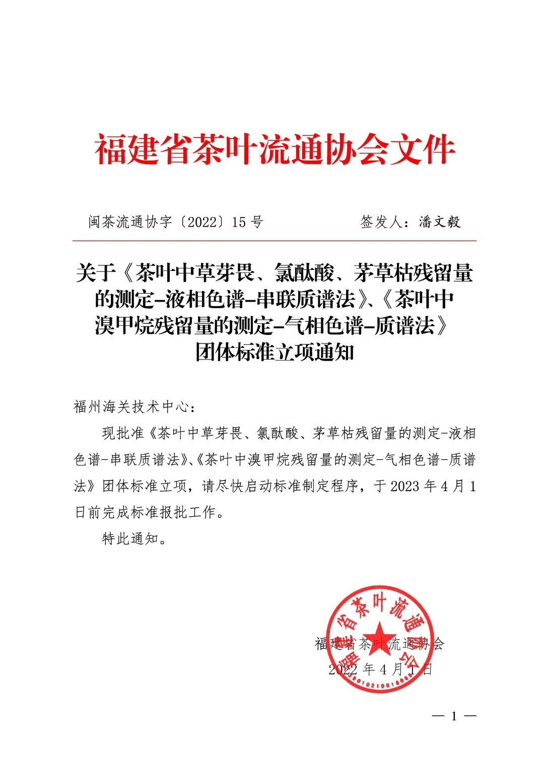 经我会研究同意《茶叶中草芽畏、氯酞酸、茅草枯残留量的测定-液相色谱-串联质谱法》、《茶叶中溴甲烷残留量的测定-气相色谱-质谱法》团体标准立项,具体通知如下: