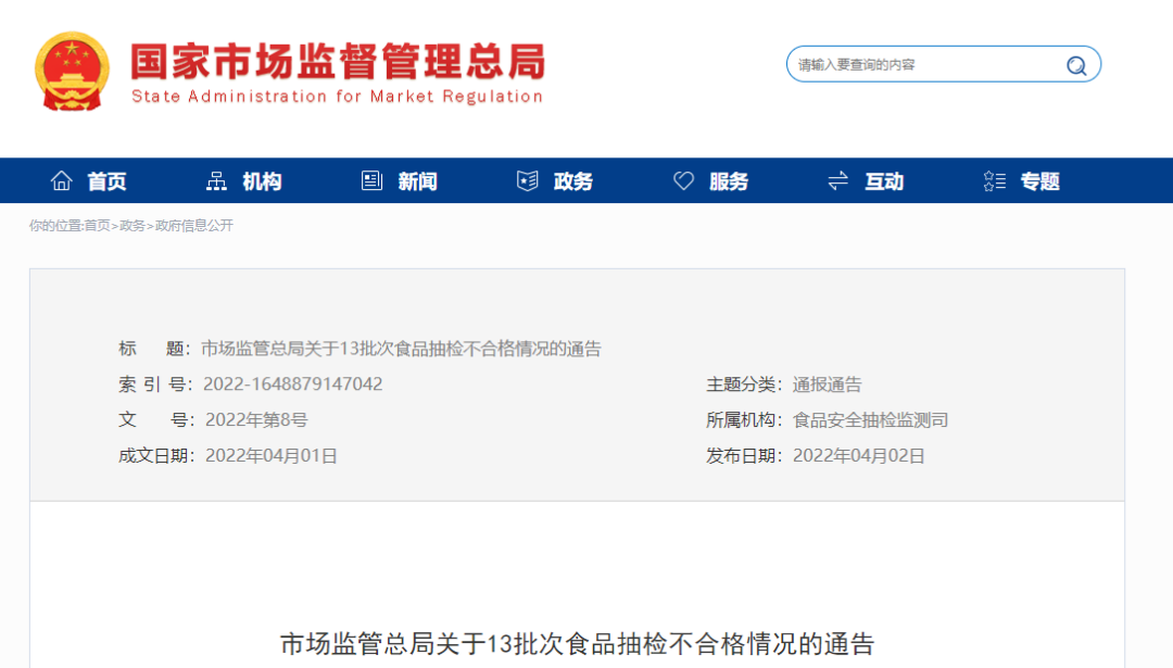 近期,国家市场监管总局组织食品安全监督抽检,抽取粮食加工品、食用农产品、食糖、茶叶及相关制品、乳制品等27大类食品650批次样品,检出其中粮食加工品、乳制品、糕点、方便食品、薯类和膨化食品、水果制品和婴幼儿配方食品等7大类食品13批次样品不合格。