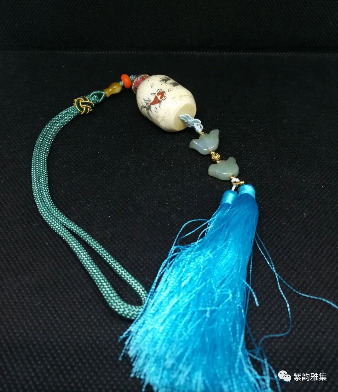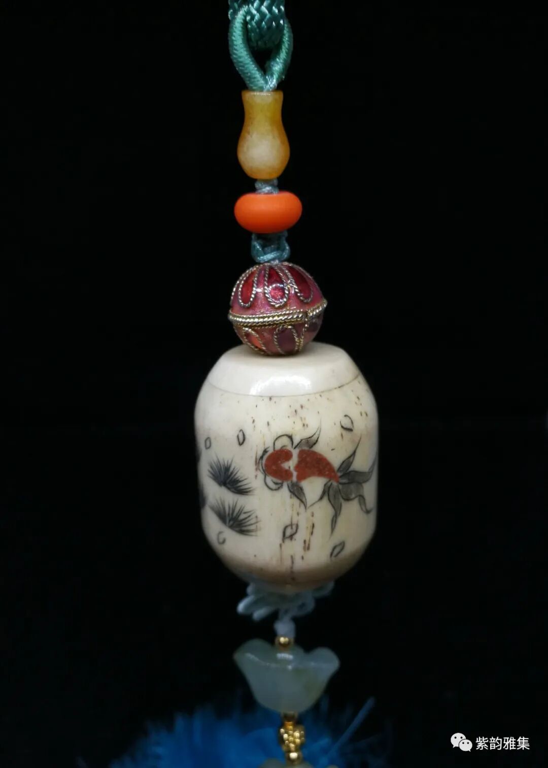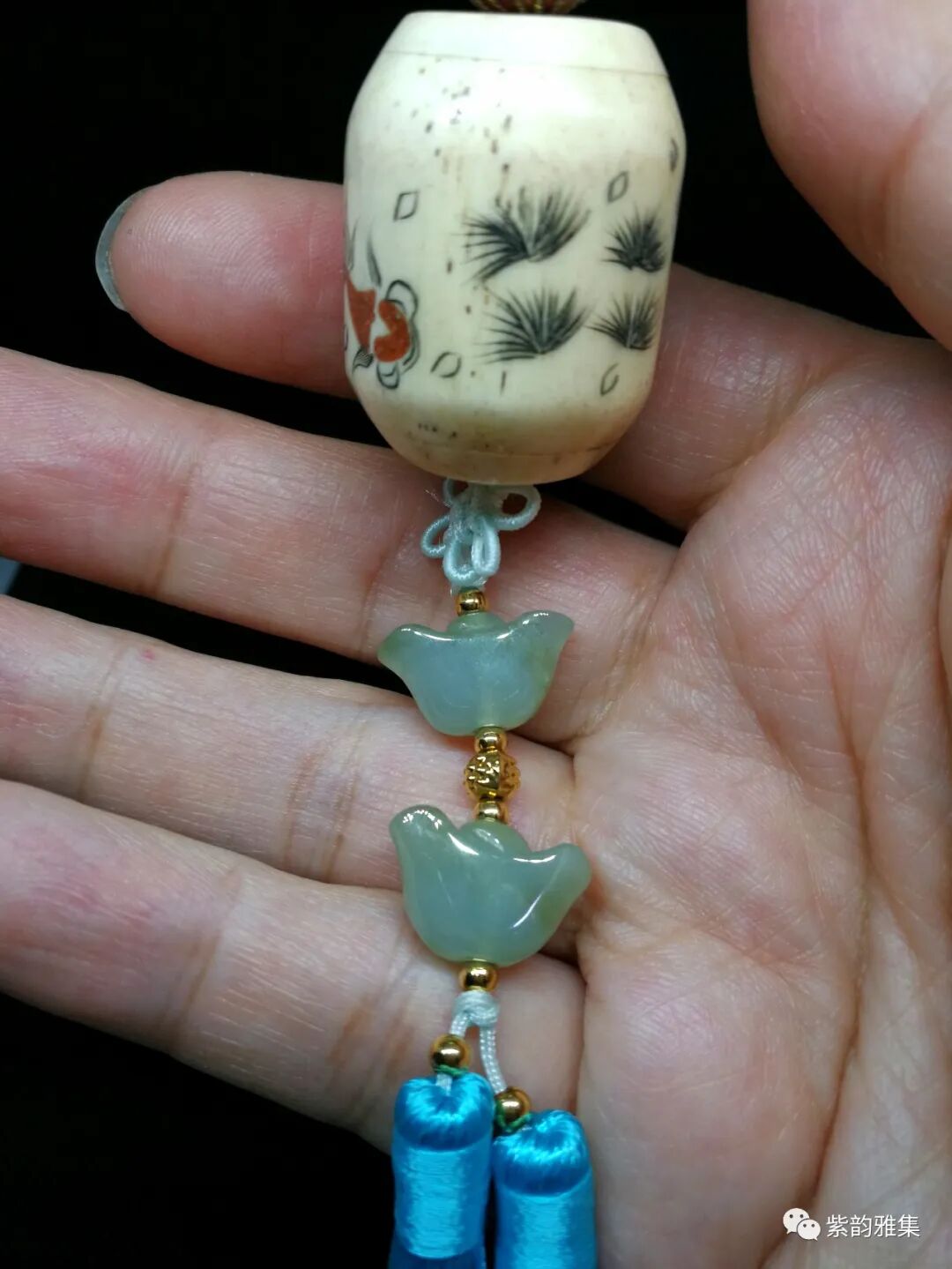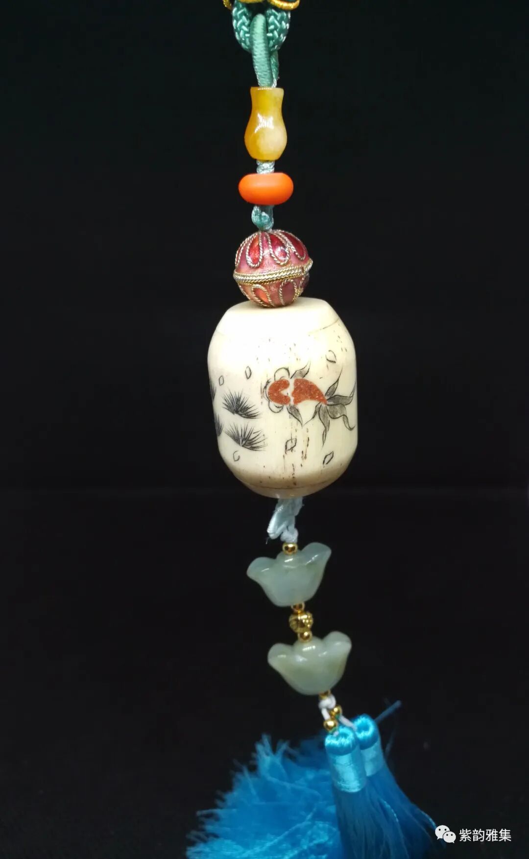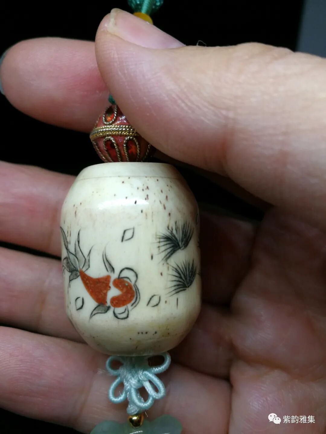 描述:此挂件为骨质雕刻,以刀代笔,刻绘生动,为70年代创汇期所做。金鱼的题材,为中国人民喜闻乐见。有很多吉祥的寓意:年年有余,吉庆有余,金玉满堂等等。底部装饰翡翠元宝,更有富贵绵延不断之意。为理想的车内或居家挂饰。