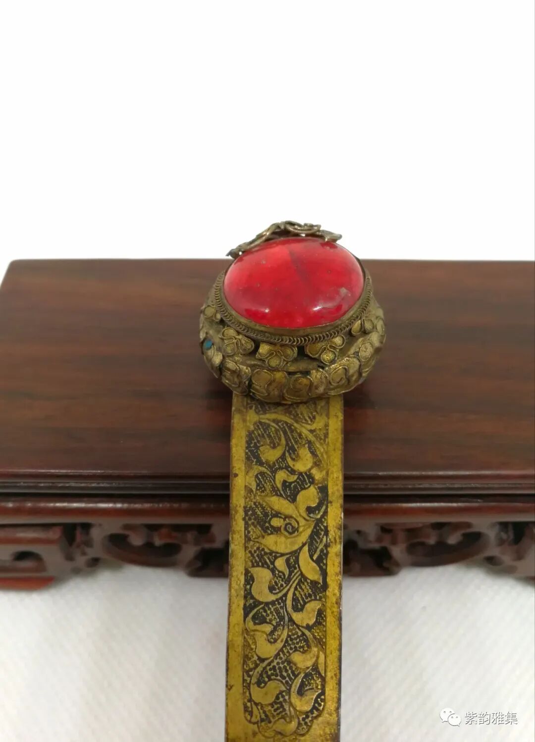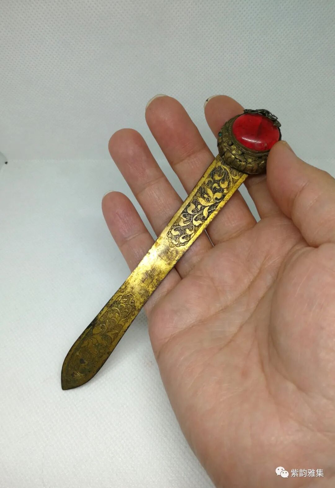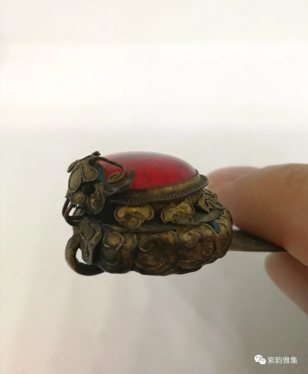 发钗是古代常见首饰,已有上千年历史,此件铜质镶嵌发钗,为铜质,发钗有细刻花卉图案,顶部为有机仿红宝石镶嵌,周围掐丝镶嵌,工艺复杂,为大户人家妇女饰品,此拍品必为收藏民间首饰爱好者所青睐。