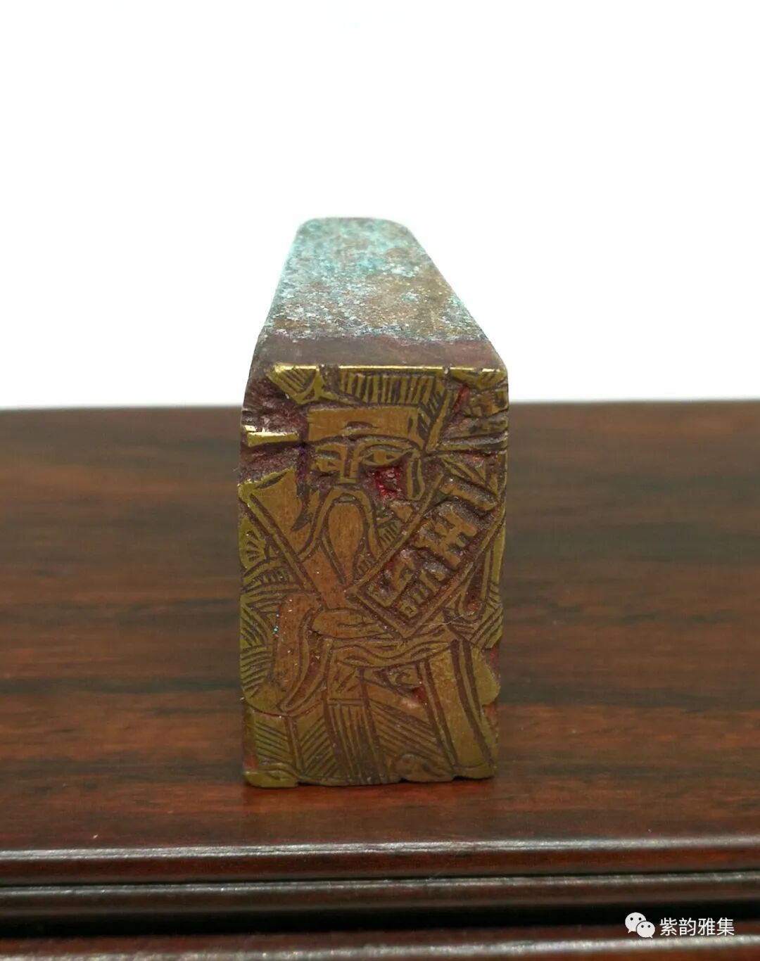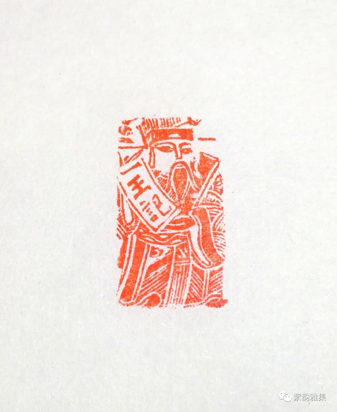 描述:民国时期商品意识觉醒,各个商家在自己的票据、传单、包装上盖印,成为独特的一个实用印品种,称为:商号印。此商号印在铜坯上手工雕刻财神图案,刀法紧凑、爽利,非一般俗手所做,财神手中画卷刻有:“王记”字样。