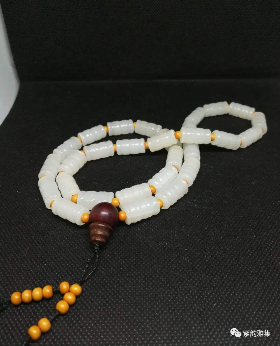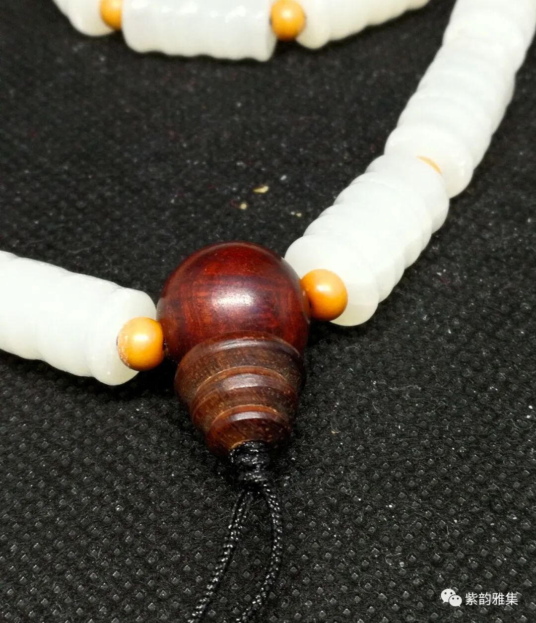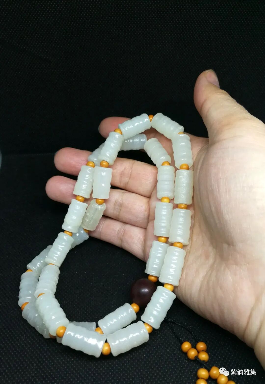 描述:此件玉质洁白,工艺精细。隔珠为木质,佛头为红木质,纹理清晰、自然。此件可以做挂饰,也可以改制手串,至少能改4条。