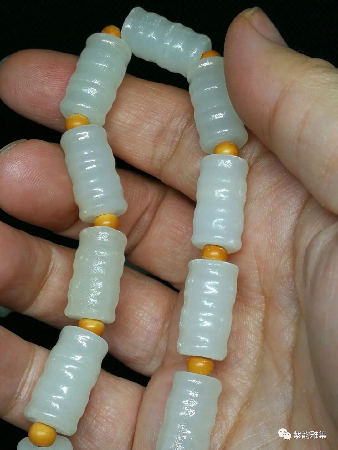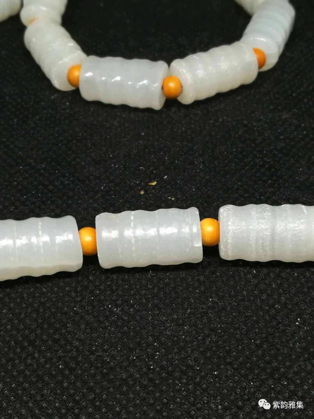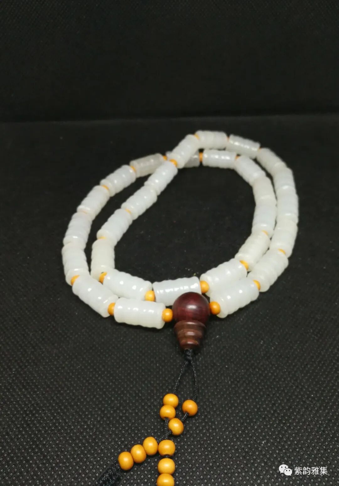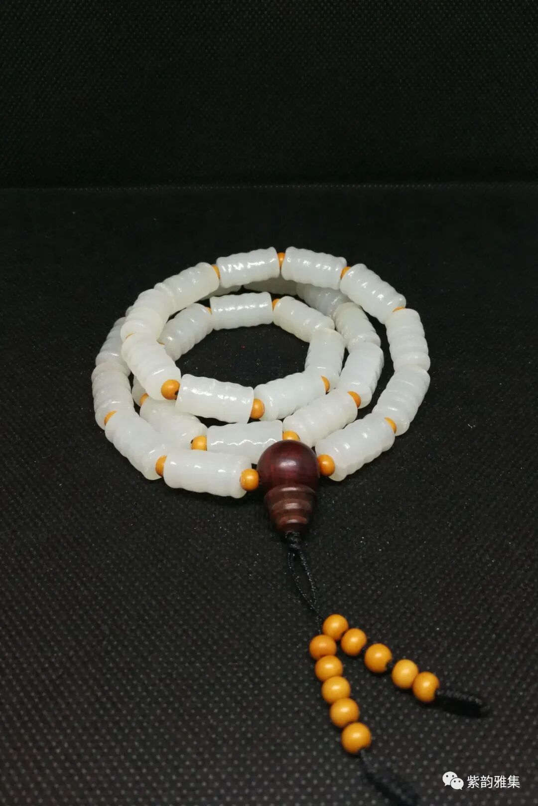 描述:此件玉质洁白,工艺精细。隔珠为木质,佛头为红木质,纹理清晰、自然。此件可以做挂饰,也可以改制手串,至少能改4条。