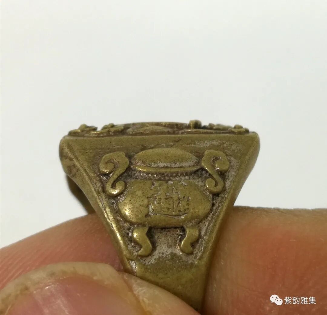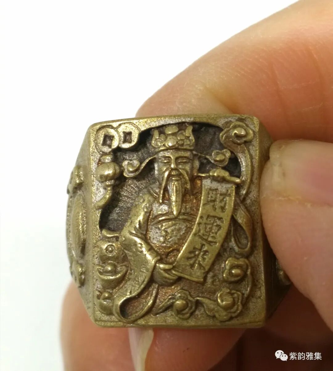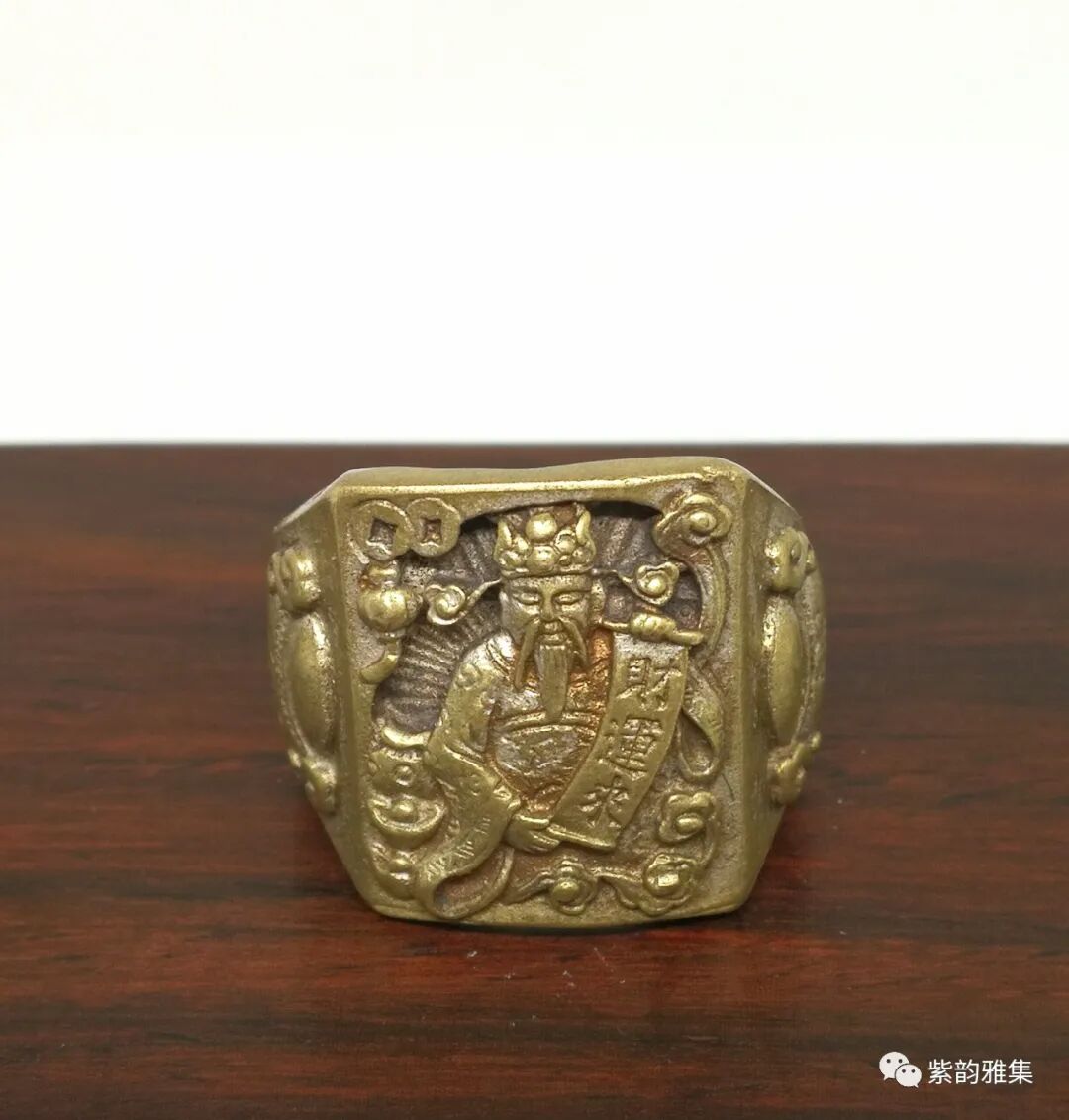 描述:戒指为民国时期铸造,为财神图案,此戒指铸造精细,小中见大,画面至少三个层次,两边还有招财进宝香炉图案。