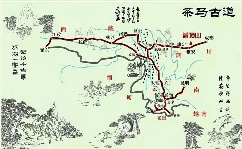 有段时间我们也把万里茶道称为茶马古道,但这个茶马古道跟云贵川地区的茶马古道不是一个概念。云贵川的茶马古道是指以马运茶的贸易路线,而这个茶马古道是以茶来换马即茶马互市的一条道。不过现在统一把这边叫做万里茶道。云贵川地区的茶马古道与万里茶道有很多共同的地方,第一,运输的茶类都大部分是黑茶类。万里茶道运输的茶像赤壁青砖茶、安化黑茶就都是黑茶,茶马古道运输的茶如云南普洱茶、四川雅安的康砖茶也是黑茶。所以运输的茶类以黑茶为主,也有一些其它茶类作为补充。第二,万里茶道和茶马古道都是向外边销然后走出国门的。赤壁青砖茶主要是面向蒙古地区、新疆地区并通过万里茶道到了俄罗斯,又通过俄罗斯的周转到了欧洲和中亚、西亚这些地区。普洱茶、康砖茶主要销往西藏少数民族地区 后来也到了邻近的东亚国家。可见这两条道基本上覆盖了中国茶区的贸易,大部分贸易都发生于此。