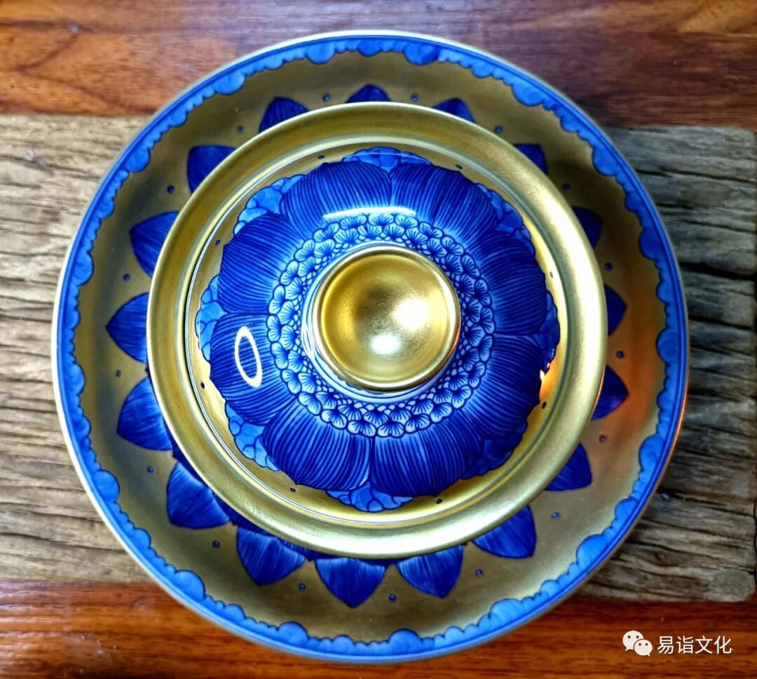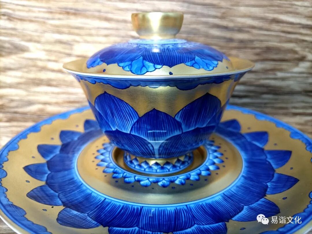 “青花瓷描黄金”莲花盖碗