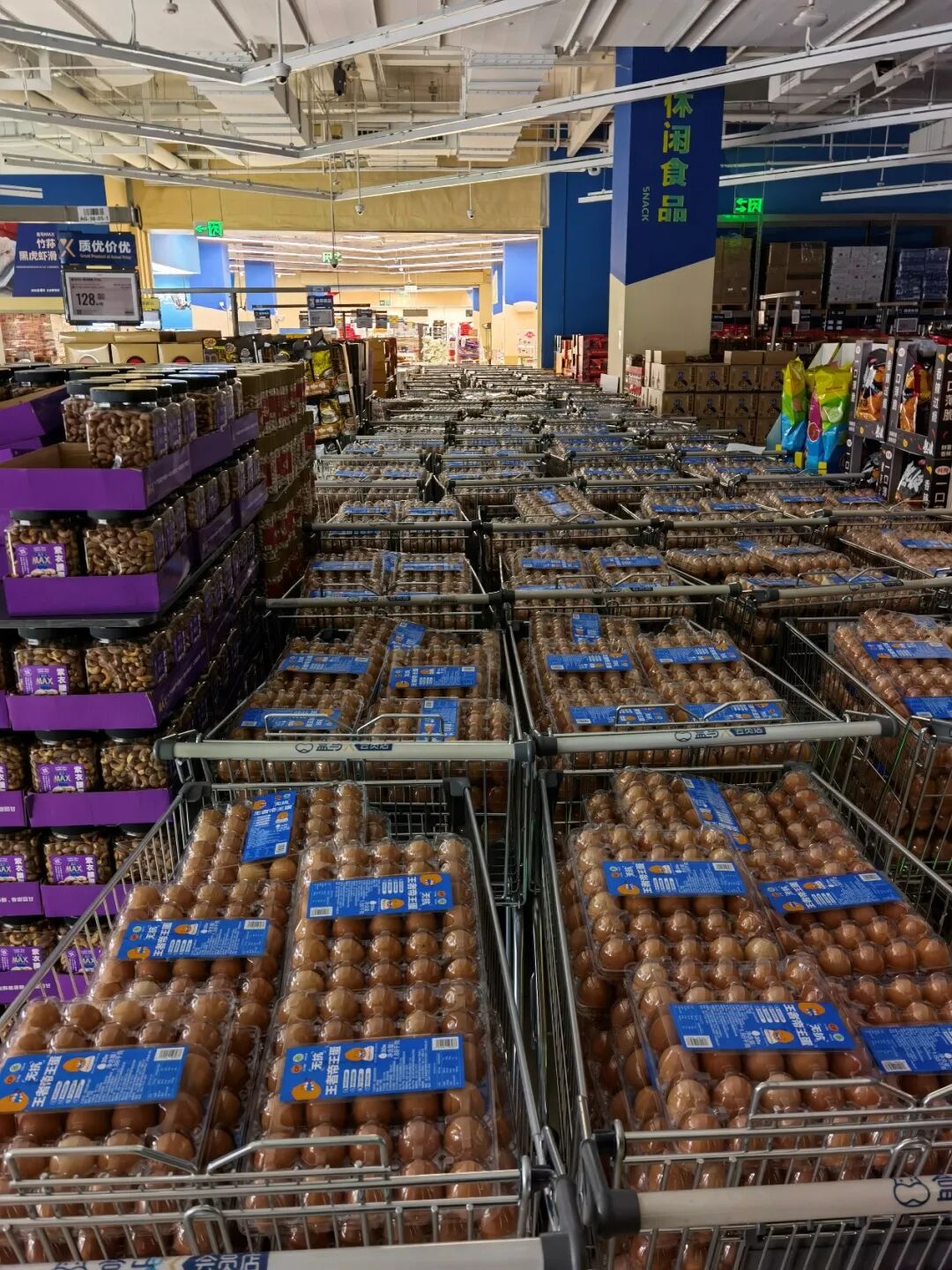 图说:上海,盒马X会员店内,深夜到货待发的必须生活物资。鸡蛋,在购物车中排成长队。