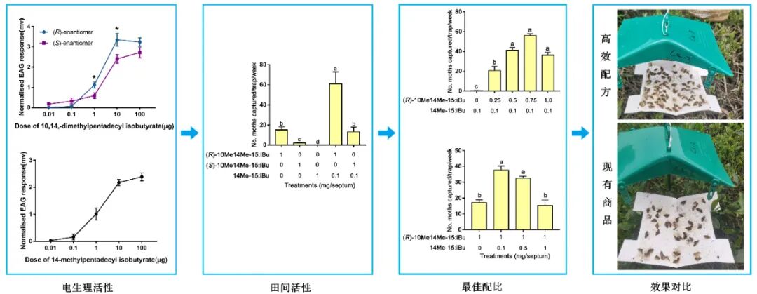 以往的研究报道显示,中国种群茶毛虫性信息素仅有10,14-二甲基十五醇异丁酸酯一个组分,且该组分的两个手性对映体田间引诱活性差异不显著。本研究通过系统的研究,明确了R体的电生理和田间活性均显著强于S体,14-甲基十五醇异丁酸酯可以显著的提升主要组分的引诱活性,其亦可能是中国种群茶毛虫的性信息素次要组分。该研究为茶毛虫高效性诱剂的开发奠定了基础。