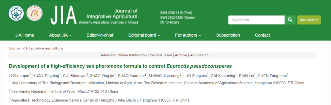 近期,中国农业科学院茶叶研究所陈宗懋院士团队完成的题为“Development of a high-efficiency sex pheromone formula to control Euproctis pseudoconspersa”的研究论文在Journal of Integrative Agriculture (《农业科学学报》(英文),JIA) 优先在线发表。