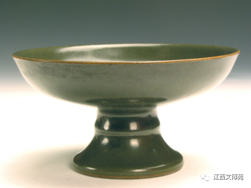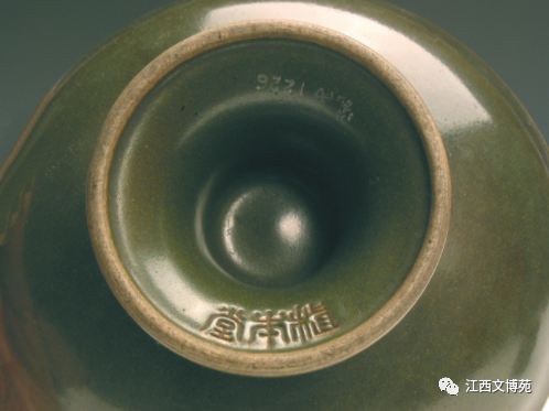 该盘可分为两部分,上部为撇口、圆盘,下部为喇叭形高足;盘壁较直,盘心弧度较大;高足上部原有两道弦纹,磨去后与足径基本持平,高足下为圈足,足径有两圈磨痕,足底露胎。全器施茶叶末釉,褐、绿相杂,黄、墨相间,釉面光亮,釉色于纯净中显现丰富的层次;盘口沿为米黄色釉,足外沿下部露黄褐色胎,增加了全器的美观程度;高足内亦施茶叶末釉,近圈足一侧阴刻青灰色篆书“植本堂”3字一行横款。“植本堂”是清代乾隆、嘉庆和道光年间景德镇瓷器堂名款,为清朝皇室专用器款识。这件茶叶末器釉色纯正,绿中闪黄,如新茶般鲜嫩舒展,为清宫原藏的精致佳器。