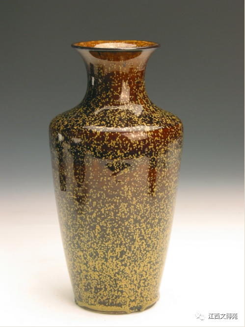 瓶为撇口,束颈,丰肩,长腹,腹下部内敛,瓶底为圈足,足底露胎。该器造型端正,轻盈秀气,颈肩处线条转换灵活,给人以舒适的美感。口沿为一圈深褐色釉,器里、器外均施鳝鱼黄釉,于红褐色釉体上散布星星点点的黄色斑点,口部、颈部斑点略少,像花丛中结队飞舞的黄蜂;肩部黄釉渐多,似夜空里闪烁的繁星;腹下部斑纹稠密,如出炉钢花耀眼缤纷;底足外部有垂釉现象,并形成一圈黄釉边,增加器表的变化与美感;器底为黄色釉酱。亦分布有浅黄色斑点,无款识。全器色彩鲜明,黄色亮釉斑点在暗褐色底釉衬托下闪闪发光,其彩釉之美令人赞叹。此件鳝鱼黄釉器物为清晚期景德镇所烧制,属于茶叶末中黄斑点的典型器,为清宫传世佳品。