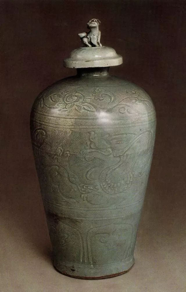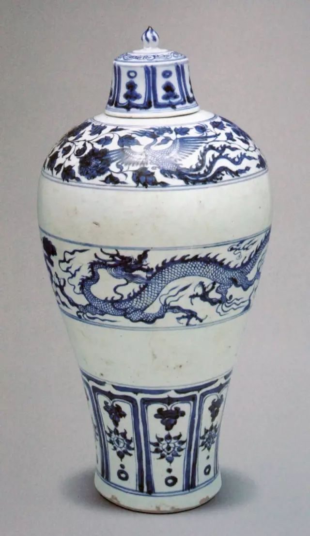 到元代,景德镇的梅瓶把瓶盖和瓶体做了更为紧密的统一和连贯设计,瓶盖在以往的覆杯式盖顶加上了宝珠钮,成为新型的宝珠钮钟式盖,瓶盖的装饰与瓶身的肩、腹、胫各层饰纹取得对比、呼应的协调效果。