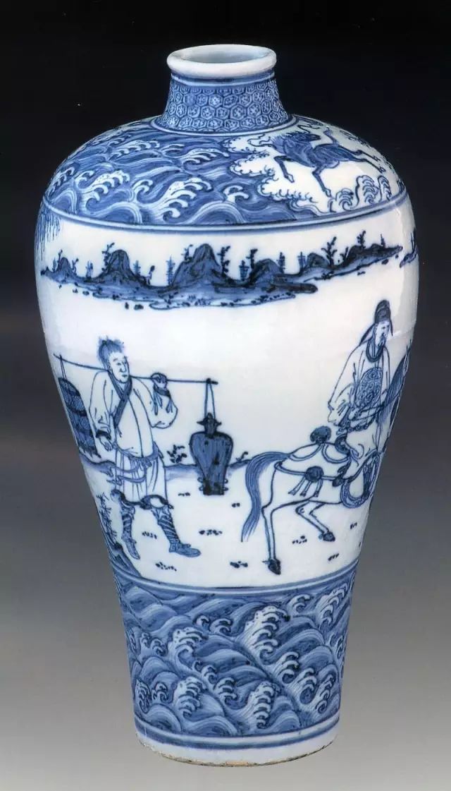 明代,创造了最丰富和最具时代面貌的梅瓶装饰面貌。由于在格式上难以出新,所以明代梅瓶便在装饰上追求出奇。明代梅瓶装饰几乎调动了所有已知和已掌握的釉、彩、纹对梅瓶进行多种装饰尝试,其中使用最多的还是青花。在纹饰布局中,三层的分层格式成为绝对主流。